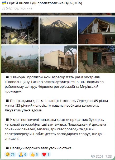 07.35 С вечера и ночью войска РФ пять раз обстреляли Никопольщину из тяжелой артиллерии и РСЗО.