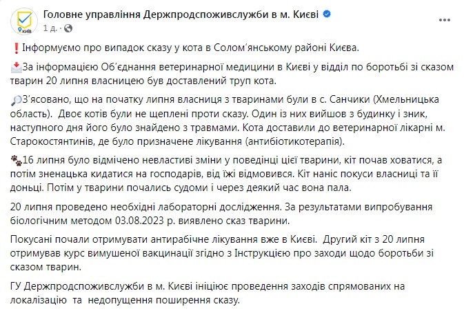 В столичный отдел по борьбе с бешенством животных 20 июля женщина доставила труп своего кота. Как оказалось, в начале июля хозяйка животного вместе с двумя кошками посещала село Санчики в Хмельницкой области. Оба питомца не были привиты против бешенства. Один из них ушел из дома и пропал, но на следующий день его нашли с травмами. Кота доставили в ветеринарную больницу Староконстантинова, где ему назначили лечение - антибиотикотерапию.