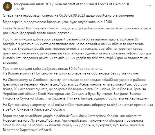 Утром, 9 августа, Генштаб ВСУ обнародовал сводку о ситуации на фронте.