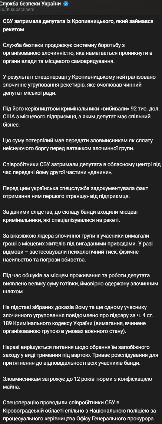 "В результате спецоперации в Кропивницком нейтрализована преступная группировка рэкетиров, которую возглавлял действующий депутат городского совета. Под его руководством уголовники "выбивали" 92 тыс. дол. США из местного предпринимателя, с которым депутат имеет общий бизнес", - говорится в сообщении.