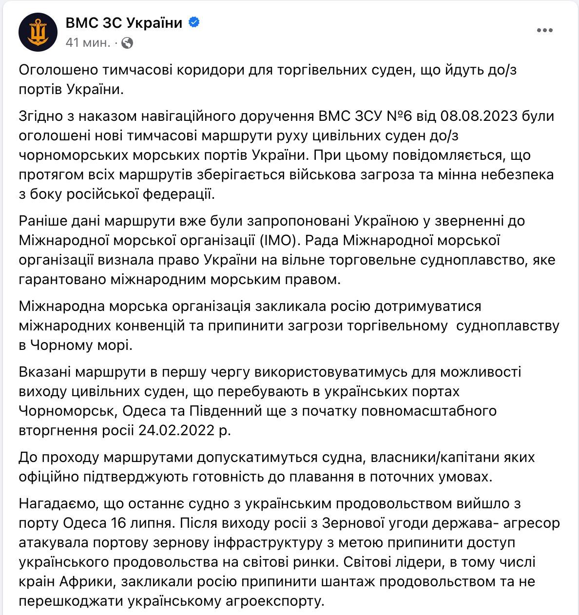 По его словам, проход судов будет осуществляться под прикрытием ВСУ.