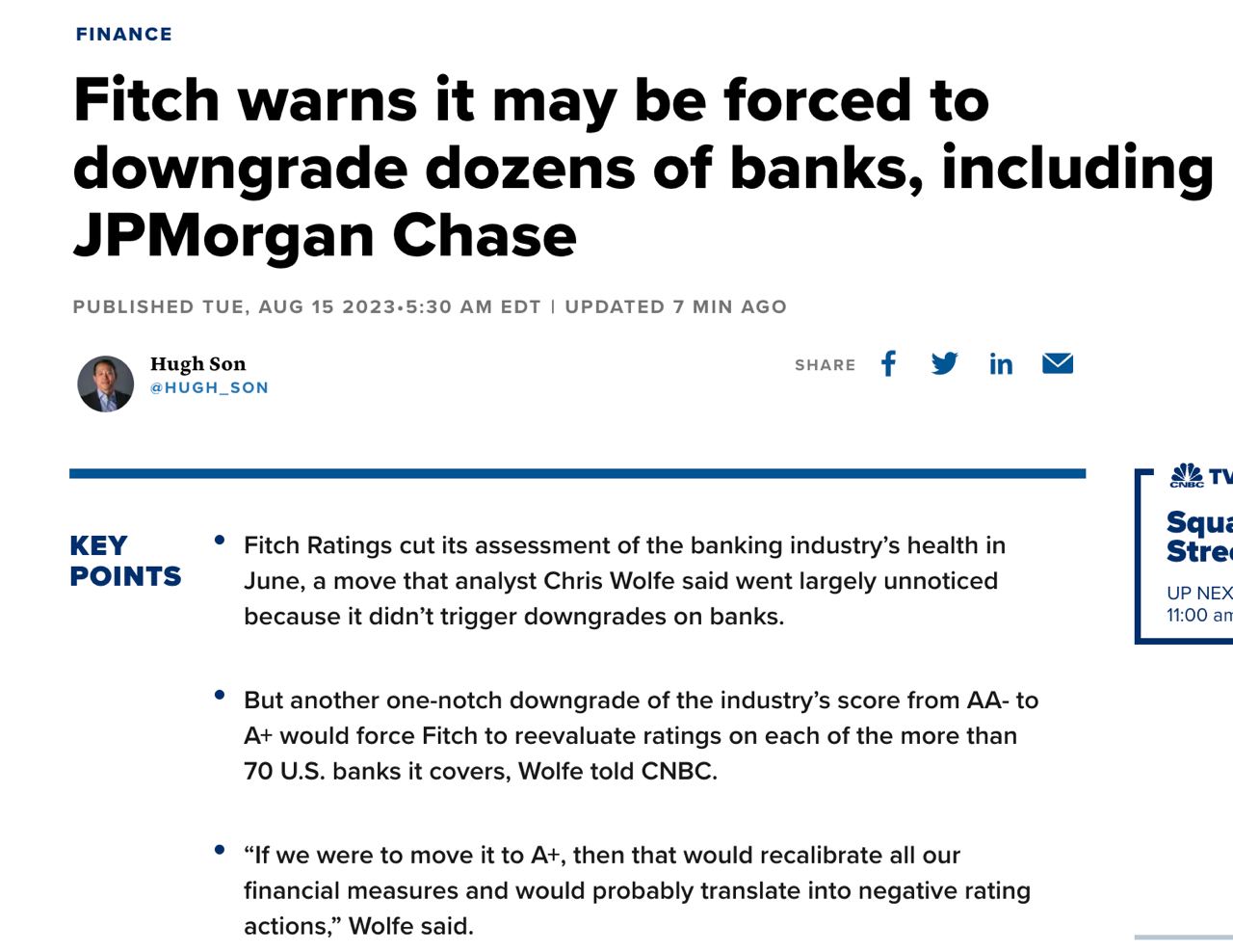 Рейтинговое агентство Fitch Ratings снизило свою оценку состояния банковской отрасли США еще в июне. Это не привело к понижению рейтингов банков, однако снижение не окончательное, и агентство может быть вынуждено снова прибегнуть к такой мере, пишет CNBC.