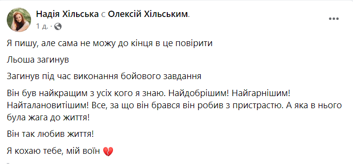 11:23 На фронте погиб украинский киноактер Алексей Хильский. Он воевал в 46-й отдельной аэромобильной бригаде в должности главного сержанта взвода разведроты.