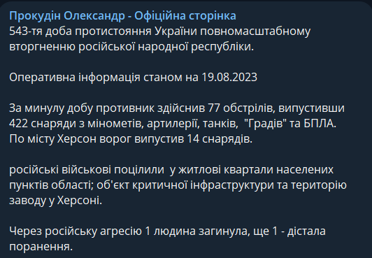 За минувшие сутки россияне 77 раз обстреляли Херсонскую область, выпустив 422 снаряда из минометов, артиллерии, танков, "Градов" и БПЛА. По городу Херсон враг выпустил 14 снарядов.