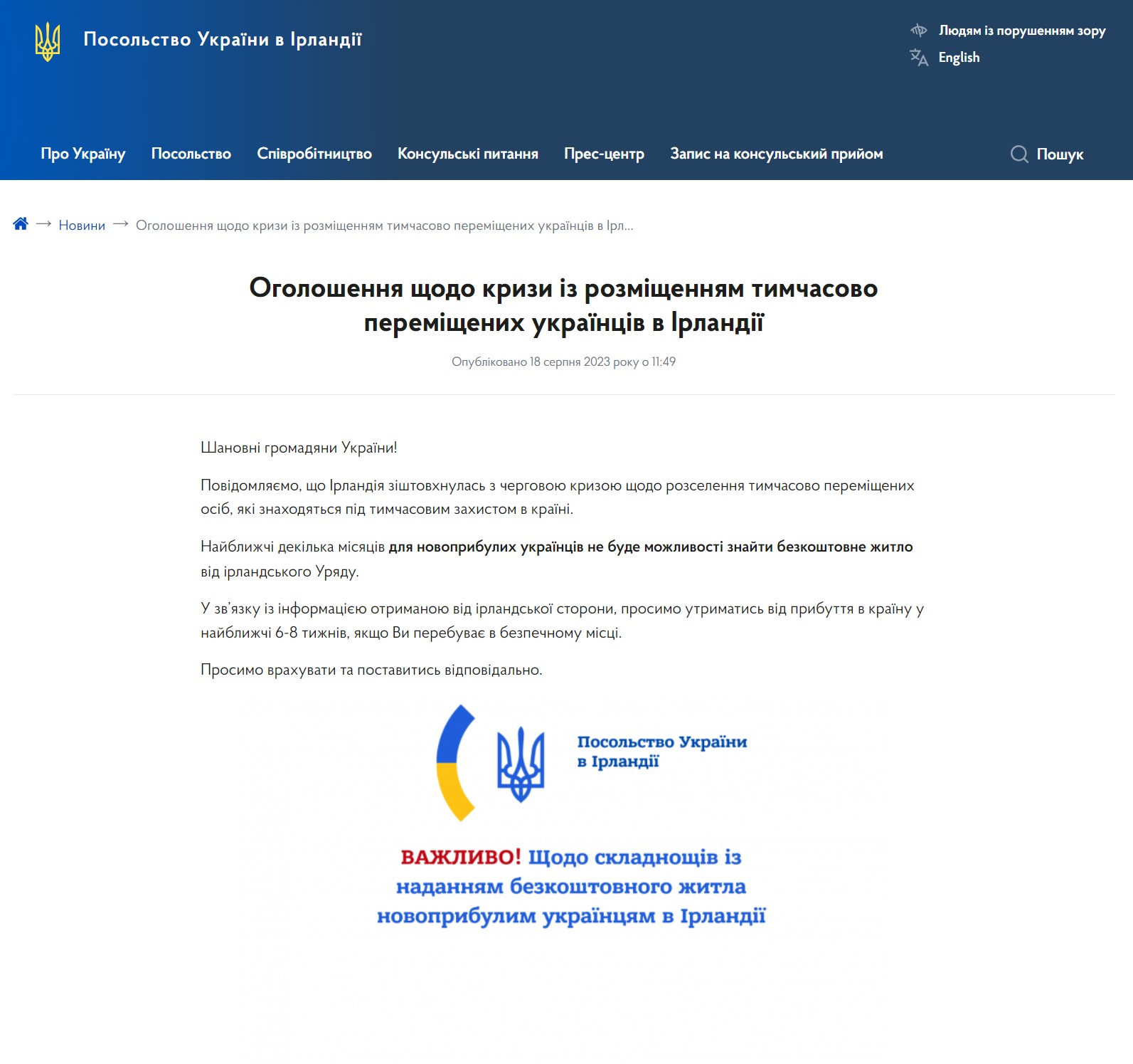 "В связи с информацией, полученной от ирландской стороны, просим воздержаться от прибытия в страну в ближайшие 6-8 недель, если Вы находитесь в безопасном месте", – говорится на сайте посольства.