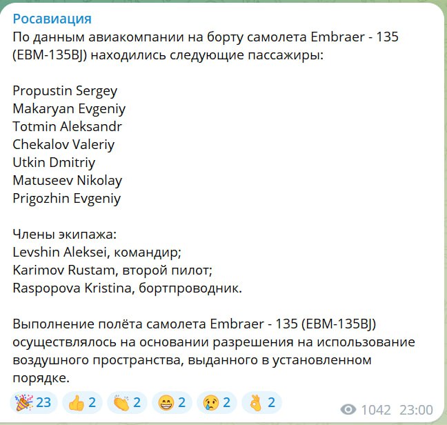 Российские телеграмм-каналы публикуют информацию о пассажирах самолёта, которые разбились вместе с Евгением Пригожиным: