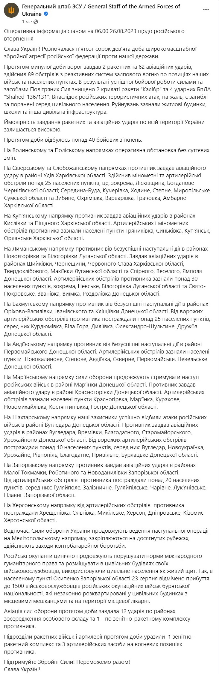 За прошедшие сутки российские войска нанесли 2 ракетных и 62 авиационных удара, совершили 89 обстрелов из реактивных систем залпового огня по позициям наших войск и населенным пунктам. В течение суток произошло более 40 боевых столкновений.