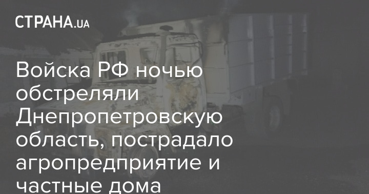 Этой ночью российские войска обстреливали из тяжелой артиллерии населенные пункты Днепропетровской области. Есть повреждения частных домов, хозяйственных построек, также на одном из агропредприятий произошел пожар.