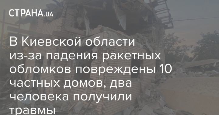 В Киевской области из-за падения обломков сбитых ночью ракет два человека получили травмы. Также пострадали десять частных домов. Повреждены две машины и ангар для хранения сельхозтехники.