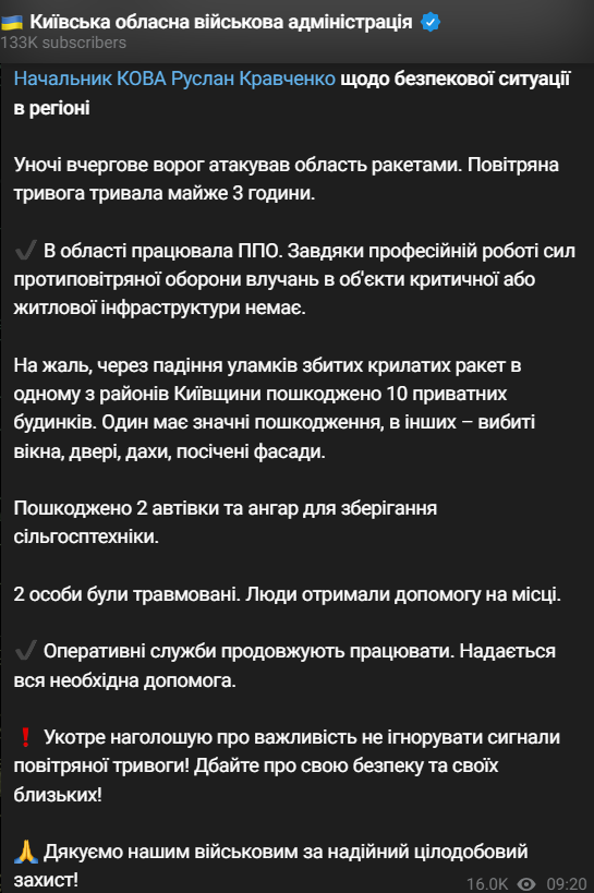 "Из-за падения обломков сбитых крылатых ракет в одном из районов Киевщины повреждены 10 частных домов. Один имеет значительные повреждения, у других – выбитые окна, двери, крыши, иссеченные фасады", - написал Кравченко.