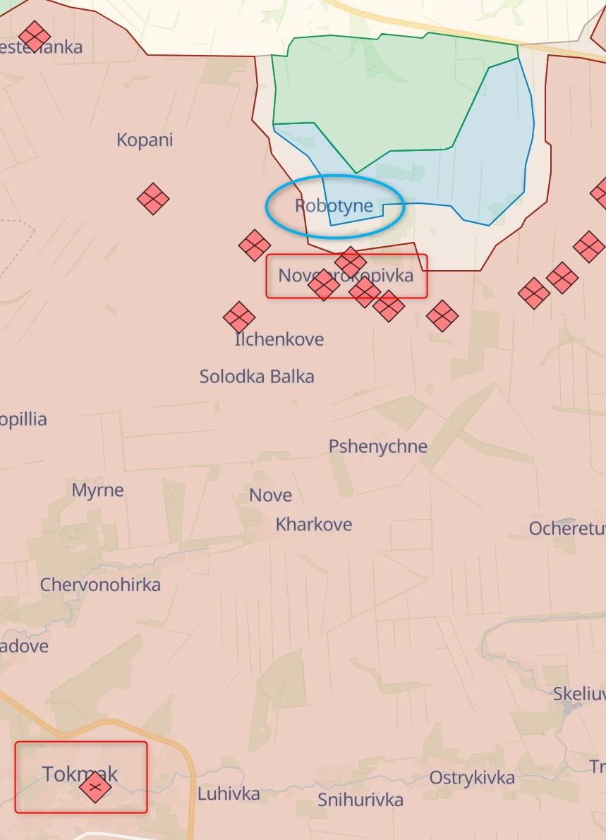 Работино и Новопрокоповка - села на пути к Токмаку. Этот крупный транспортный узел считается главной тактической целью наступления ВСУ на данном направлении. В случае его взятия украинская армия получит возможность наносить удары по главной дороге снабжения российских войск на юге Украины, которая идет через Мелитополь.