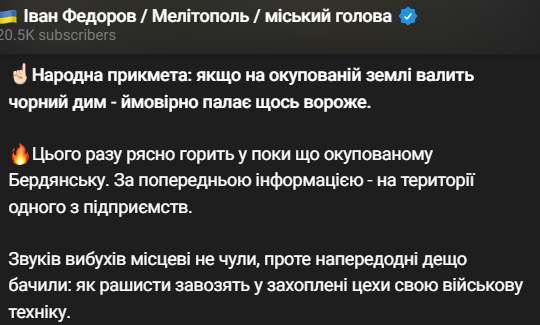 "На этот раз сильно горит в оккупированном Бердянске. По предварительной информации – на территории одного из предприятий. Звуков взрывов местные не слышали, однако накануне видели: как рашисты завозят в захваченные цеха свою военную технику", - написал Федоров.