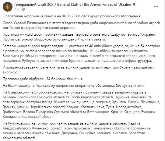 Утром 28 августа Генштаб ВСУ обнародовал сводку о ситуации на фронте.