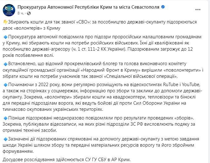 Обоим подозреваемым грозит до 12 лет тюрьмы по части 1 статьи 111-2 УК Украины.