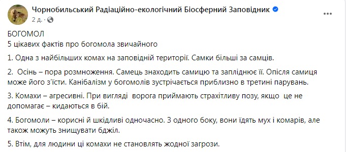 Чернобыльский радиационно-экологический биосферный заповедник опубликовал пять интересных фактов об обыкновенном богомоле.