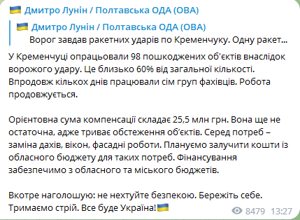 В Кременчуге ракетным ударом 22 сентября были повреждены порядка 150 зданий.
