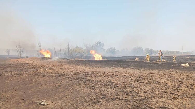 Сейчас на месте взрыва выгорают остатки газа, а спасатели ликвидируют возгорание сухой травы.