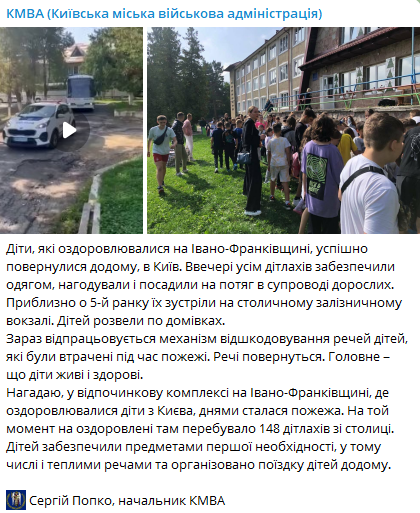 Дети, которые оздоровлялись в Ивано-Франковской области, когда в комплексе, где они находились, произошел пожар, успешно вернулись домой, в Киев.