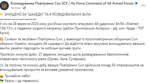 Было уничтожено 34 "Шахеда" и 6 разведывательных БПЛА