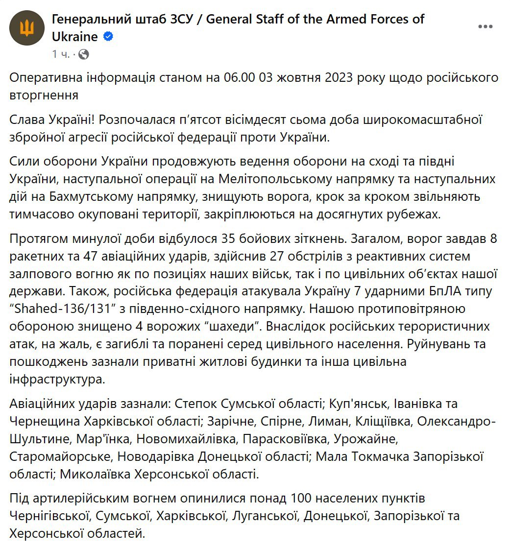 Утром, 3 октября, Генштаб ВСУ обнародовал сводку о ситуации фронте. В ней говорится о российских контратаках на всех основных фронтах.