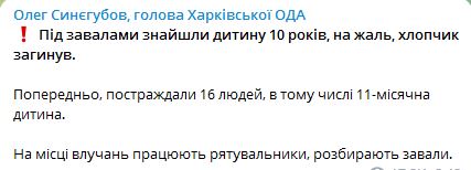 В Харькове под завалами дома нашли погибшего ребенка. Дом обрушился после ракетного удара РФ сегодня утром.