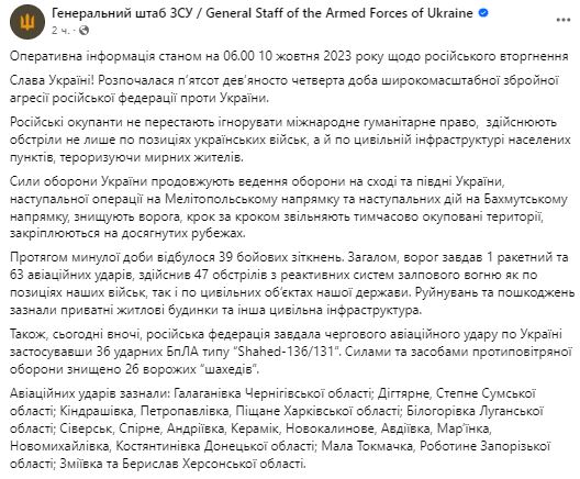 Утром 10 октября Генштаб ВСУ обнародовал сводку о ситуации на фронте.