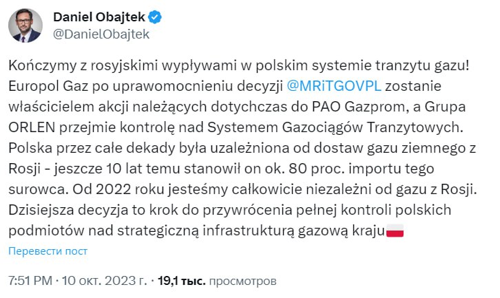 Глава концерна также добавил, что с 2022 года Польша полностью независима от газа РФ. Сегодняшнее решение является шагом к возобновлению полного контроля польских предприятий над стратегической газовой инфраструктурой своей страны.