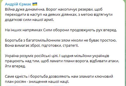 "Война очень динамичная. Враг накапливает резервы, чтобы переходить в наступление на некоторых участках с целью оттянуть дополнительные силы нашей армии. В других направлениях Силы обороны продолжают движение вперед", - написал глава Офиса президента