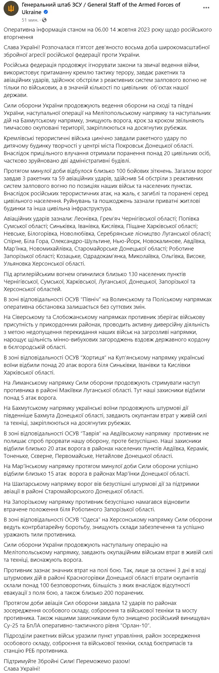 Война в Украине идет уже 598-й день. Мы следим за последними новостями и ключевыми событиями 14 октября 2023 года в обновляемом онлайне.