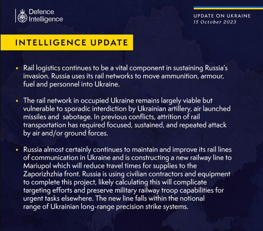 Железнодорожная логистика продолжает оставаться жизненно важным компонентом в обеспечении поддержки российского вторжения. Россия строит новую железнодорожную линию до Мариуполя, чтобы сократить время поставок на Запорожский фронт.