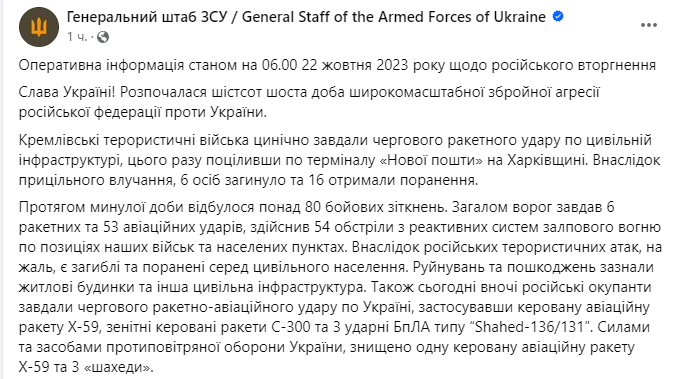 Также в Генштабе сообщили, что оссийские военные нанесли ночью комбинированную воздушную атаку по Украине, используя различные ракеты и ударные дроны.