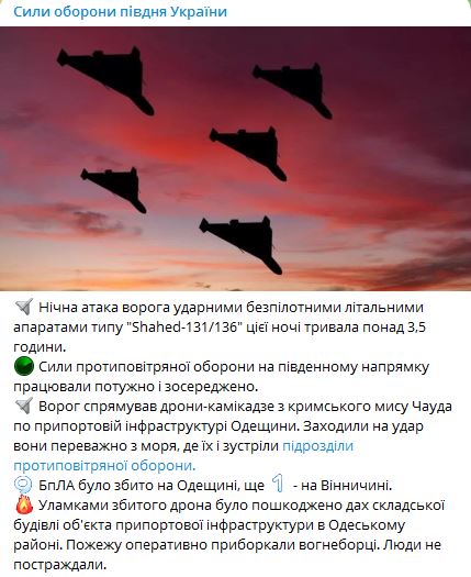 РФ выпустила дроны-камикадзе с крымского мыса Чауда по припортовой инфраструктуре Одесской области. Заходили на удар они преимущественно с моря, где их встретили подразделения ПВО.