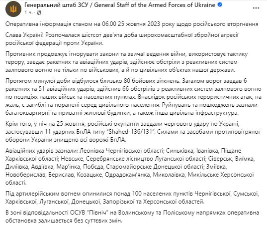 Утром, 25 октября, Генштаб ВСУ обнародовал сводку о ситуации на фронте.