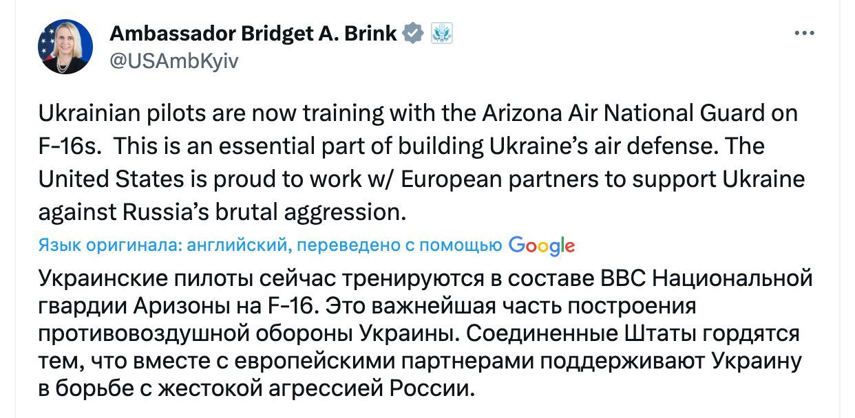 "Украинские пилоты сейчас тренируются в составе ВВС Национальной гвардии Аризоны на Е-16. Это важнейшая часть построения противовоздушной обороны Украины. Соединенные Штаты гордятся тем, что вместе с европейскими партнёрами поддерживают Украину в борьбе с жестокой агрессией России", — написала посол.