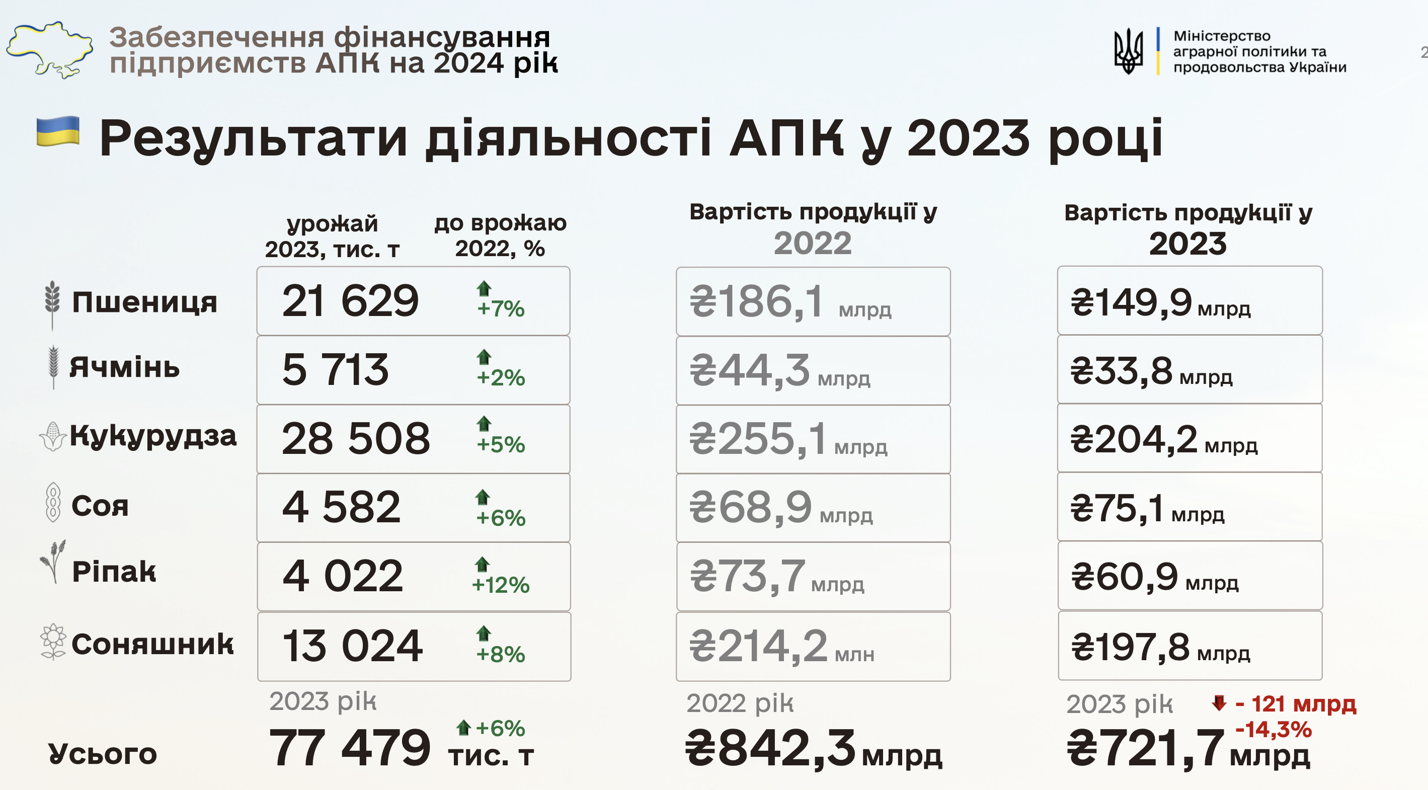 Но вот стоимость урожая по сравнению с прошлым годом (который тоже был убыточным), наоборот, упала. Например, если в 2022 году стоимость всего урожая пшеницы составляла 186,1 млрд гривен, то в этом году - 149,9 млрд. То же и по кукурузе: в минувшем сезоне - 255,1 млрд, в этом - 204,2 млрд. Урожай рапса "подешевел" с 73,7 млрд в 2022 году до 60,9 млрд в этом, подсолнечника - с 214,2 до 197,8 млрд.