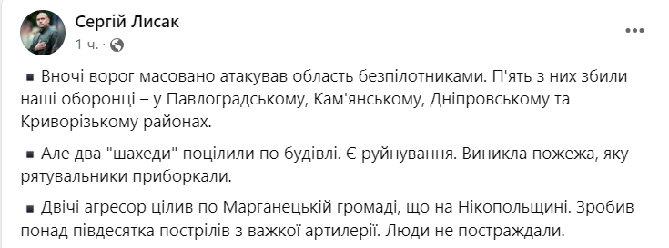 "Ночью враг массированно атаковал область беспилотниками. Пять из них были сбиты нашими защитниками – в Павлоградском, Каменском, Днепровском и Криворожском районах. Два "шахеда" попали по зданию. Есть разрушение. Возник пожар", - говорится в сообщении.