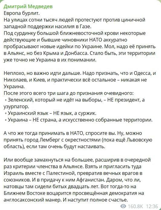 "Надо признать, что и Одесса, и Николаев, и Киев, и практически всё остальное – никакая не Украина", - написал Дмитрий Медведев.