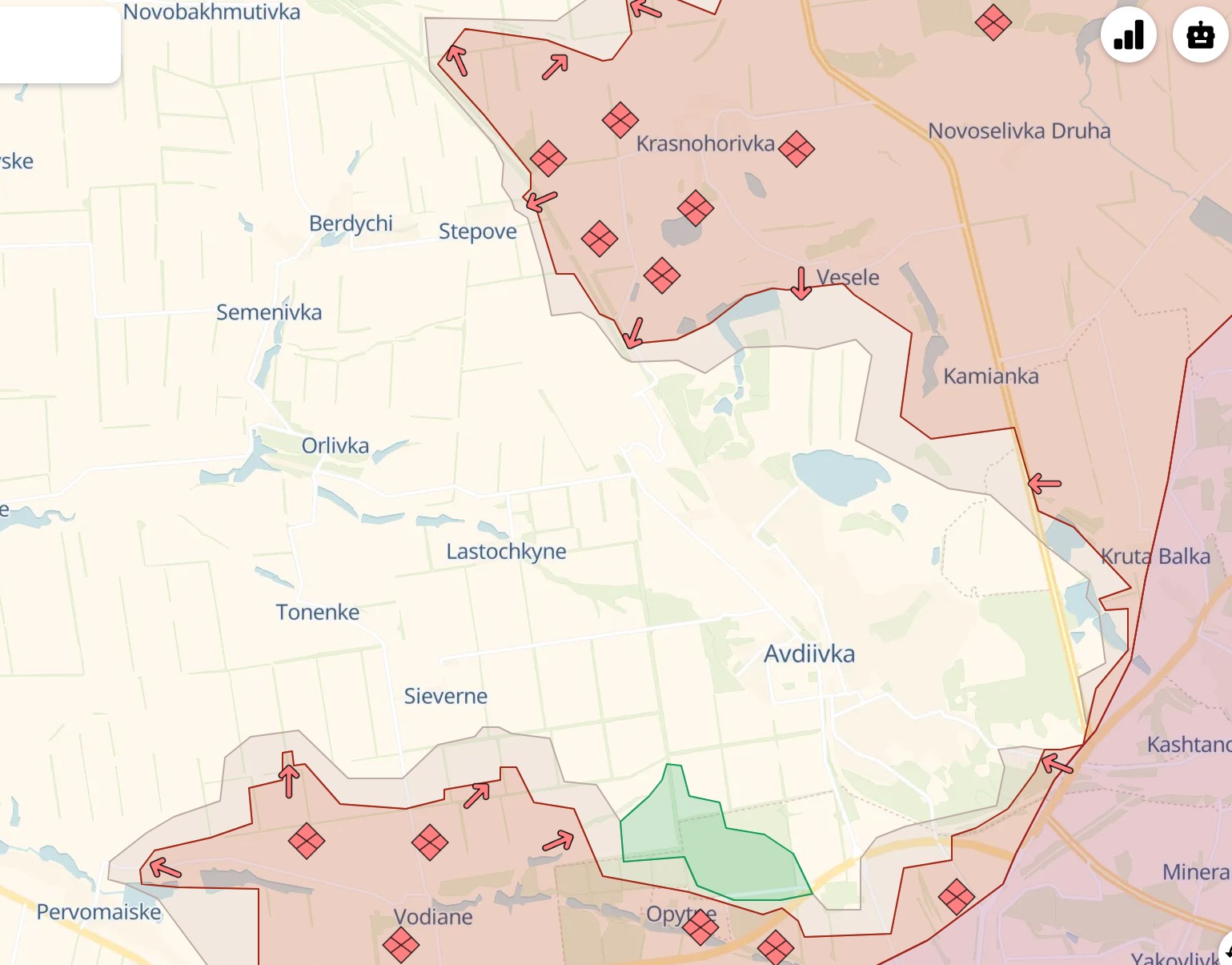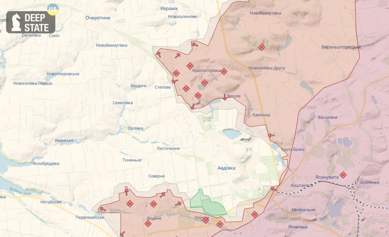 Украинский паблик Deep State сообщает о продвижении россиян в районе Новокалинового к северу от Авдеевки.