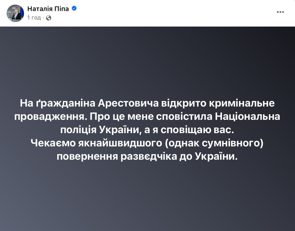 Речь идет об эпизоде, когда Арестович этим летом обратился в ГБР и обвинил Наталию Пипу в разжигании национальной розни и ненависти по языковым признакам из-за инцидента во Львове, когда нардеп сделала замечание уличному музыканту, который пел песни Виктора Цоя.