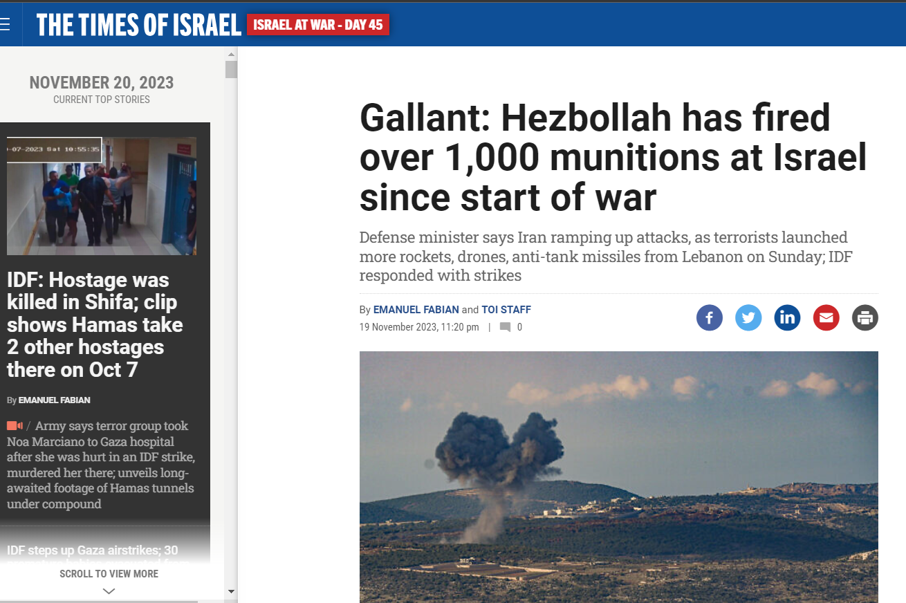 08:30 Министр обороны Израиля Йоав Галлант заявил, что поддерживаемая Ираном террористическая организация "Хезболла" с 7 октября выпустила по ним более 1000 боеприпасов.