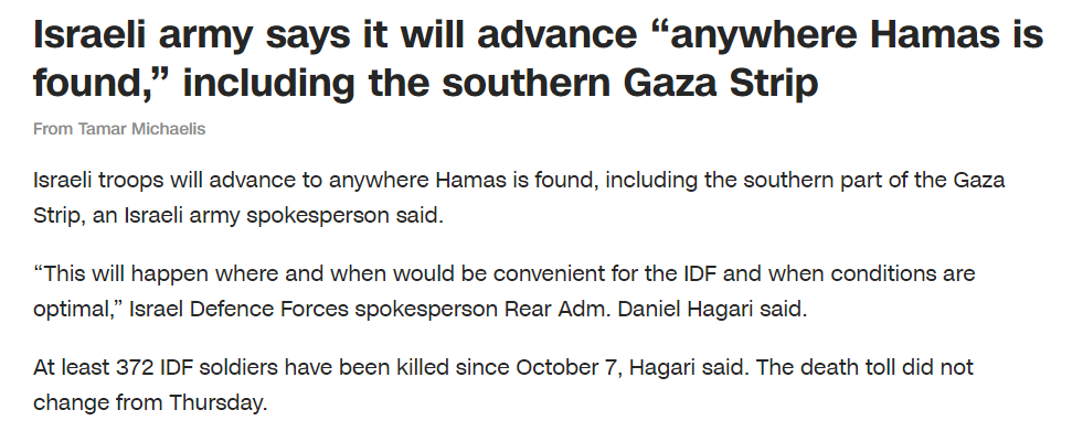 11:00 Армия обороны Израиля заявляет, что будет наступать "везде, где есть ХАМАС", включая южную часть сектора Газа.