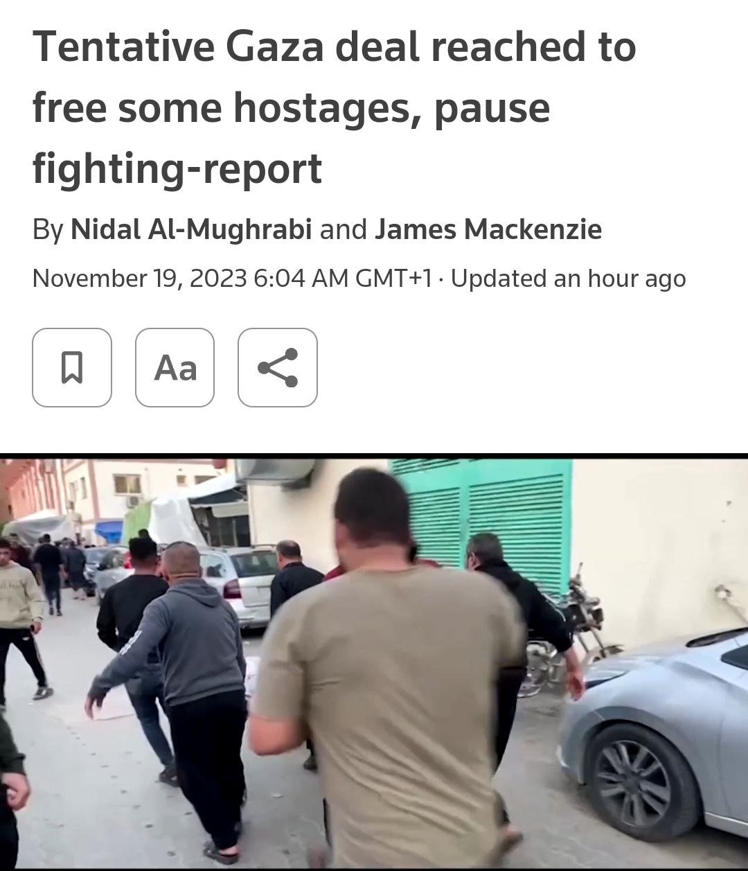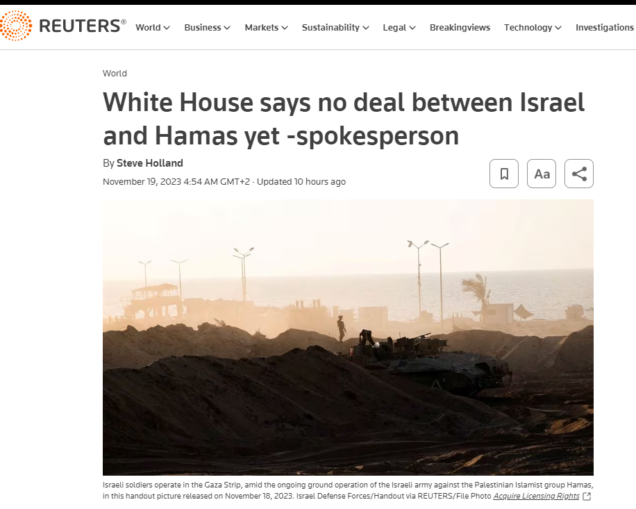 15:21 Представитель Белого дома сообщил, что на 19 ноября Израиль и ХАМАС еще не достигли соглашения о временном прекращении огня.