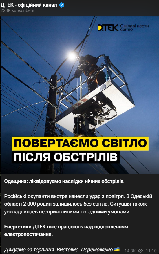В Одесской области две тысячи потребителей остались без элекричества. Фото: ДТЭК