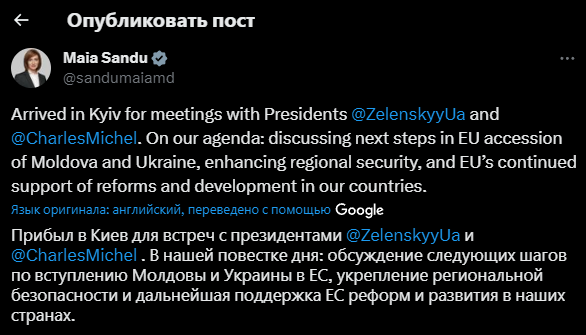 "На повестке дня: обсуждение следующих шагов по вступлению Молдовы и Украины в ЕС, усиление региональной безопасности, а также дальнейшая поддержка ЕС реформ и развития в наших странах", – отметила Санду в своём Х (Twitter).