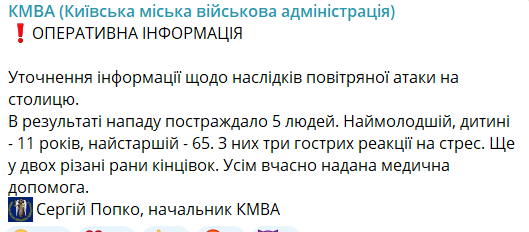 В результате массированной атаки "Шахедов" по Киеву пострадали пять человек. Об этом сообщает КГВА.