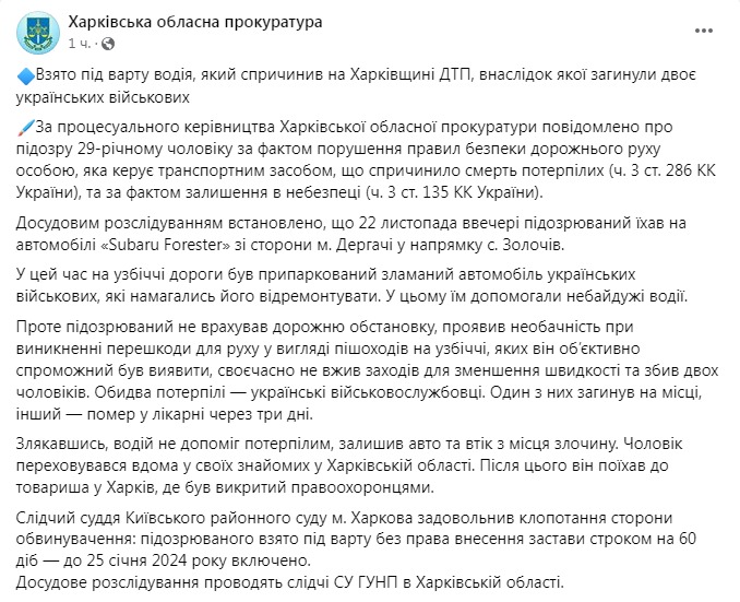 По ее данным, 22 ноября вечером подозреваемый ехал на автомобиле Subaru Forester со стороны Дергачей в направлении Золочева. В это время на обочине дороги был припаркован сломанный автомобиль украинских военных, пытавшихся его отремонтировать. В этом им помогали другие водители.