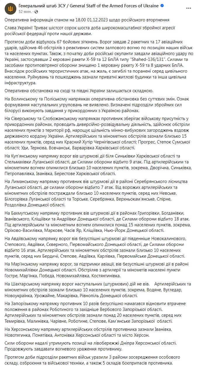 Генштаб ВСУ опубликовал оперативную информацию о ситуации на фронте по состоянию на 18:00 1 декабря.