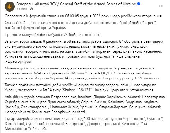 Во вторник, 5 декабря, Генштаб ВСУ обнародовал сводку о ситуации на фронте.