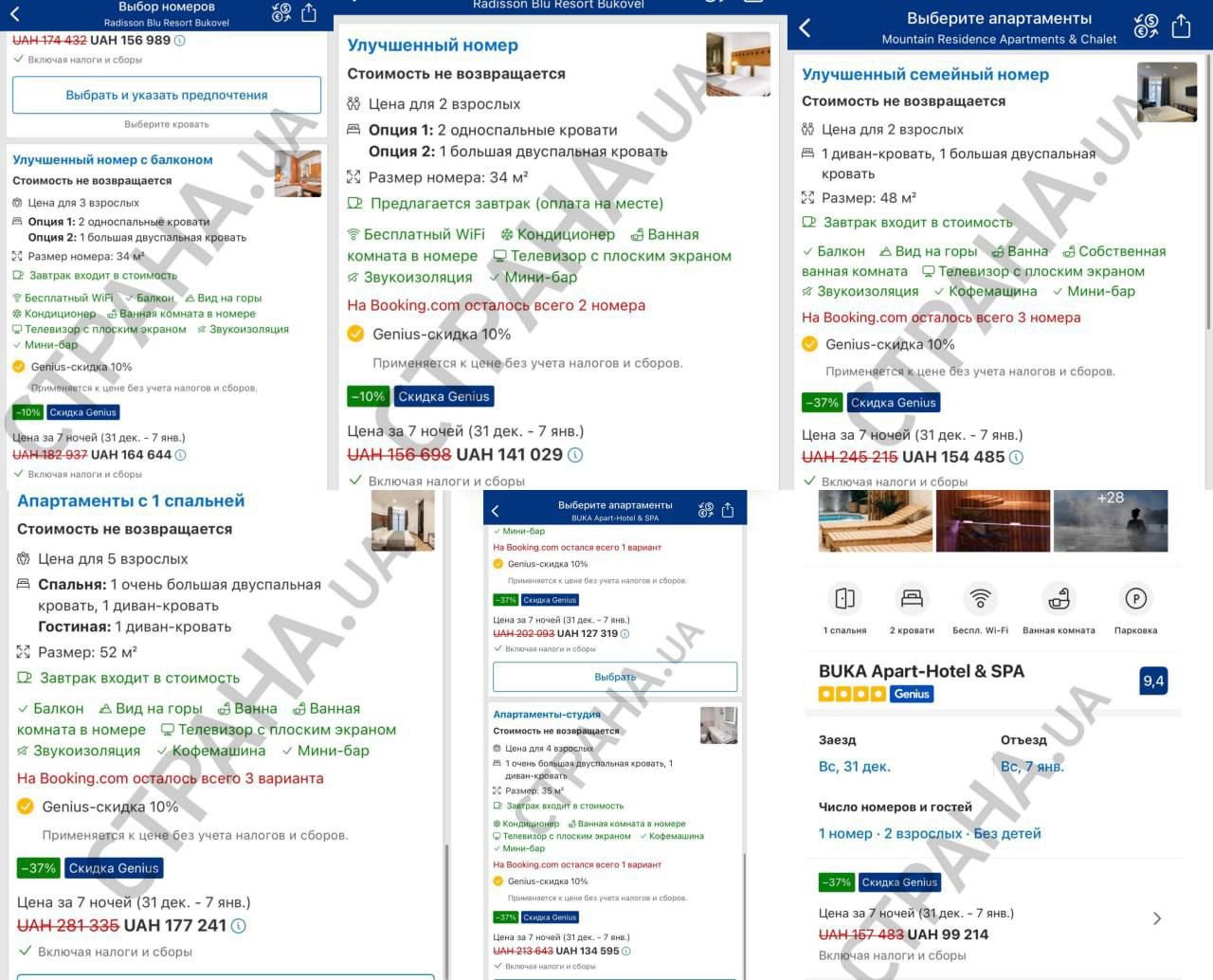 Однако есть варианты и дешевле. Например, в "BUKA Apart-Hotel & SPA" один улучшенный номер на двоих с 31 декабря по 7 января обойдется в 99 214 грн. Без скидок такой номер стоит 157 483 грн. В прошлом году номер на двоих в этом отеле был дешевле — 72 344 грн.