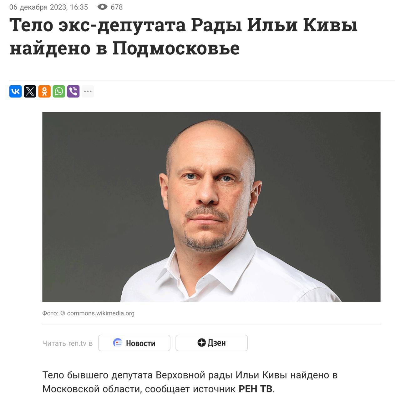 "Тело предположительно экс-депутата Верховной Рады Ильи Кивы найдено в подмосковной деревне Супонево Одинцовского района, сообщили РИА Новости в экстренных службах", - сообщило государственное информагенство РФ.